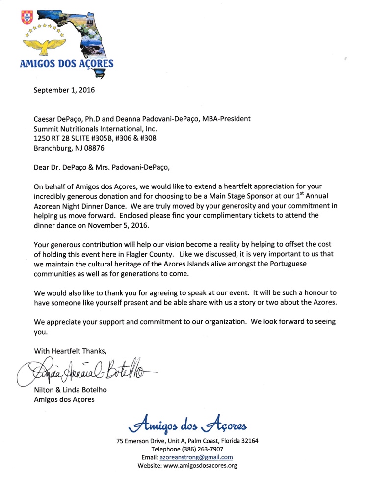 Amigos dos Açores thanks Dr. and Mrs. Caesar DePaço