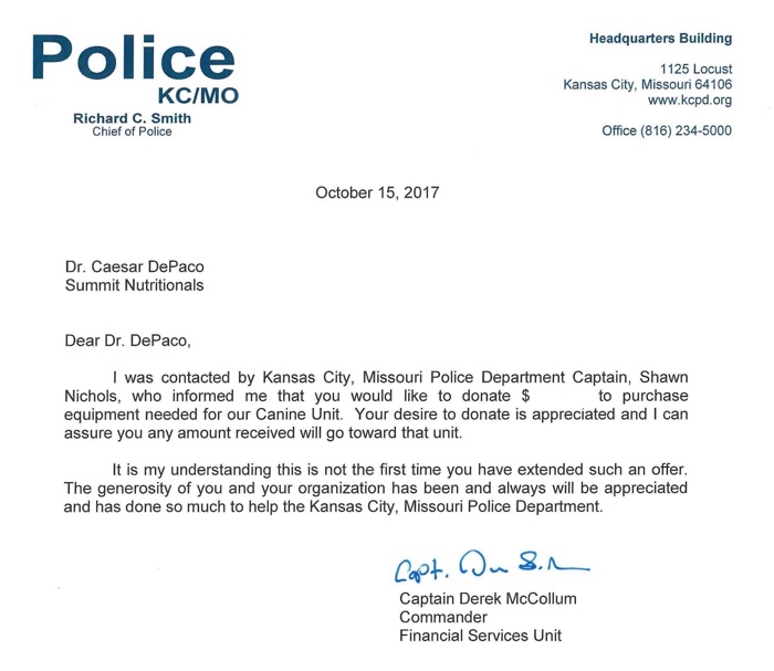 Kansas City, Missouri Police Department thanks Summit Nutritionals International ®
