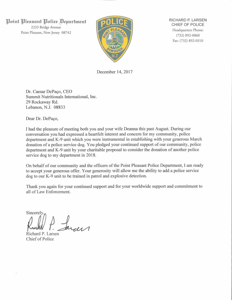 The Point Pleasant Police Department thanks Summit Nutritionals International ® for the generous offer of a specially trained dog for their K-9 unit