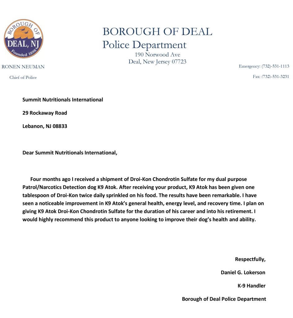 Dr. Caesar Depaco and Summit Nutritional, I am writing to express our sincere gratitude for your support and the generous donation of Droi-Kon Chondroiton Sulfate to the Oklahoma City Police Department K-9 Unit. As Police K-9 handlers we know how important it is to maintain the health and wellbeing of our K-9 partners. Your donation…