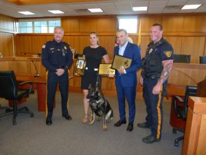 The Linwood Police Department, along with council, honored Dr. Caesar DePaço, chief executive officer of Summit Nutritionals, and his wife, Deanna Padovani-DePaço, who serves as president of the international firm. The DePaços donated $10,000 from Summit Nutritionals to the Linwood Police Department to fund the purchase of Kaos, a two-year-old German shepherd and cover the cost of training the K-9 as well as his handler, Patrolman Charles Champion.