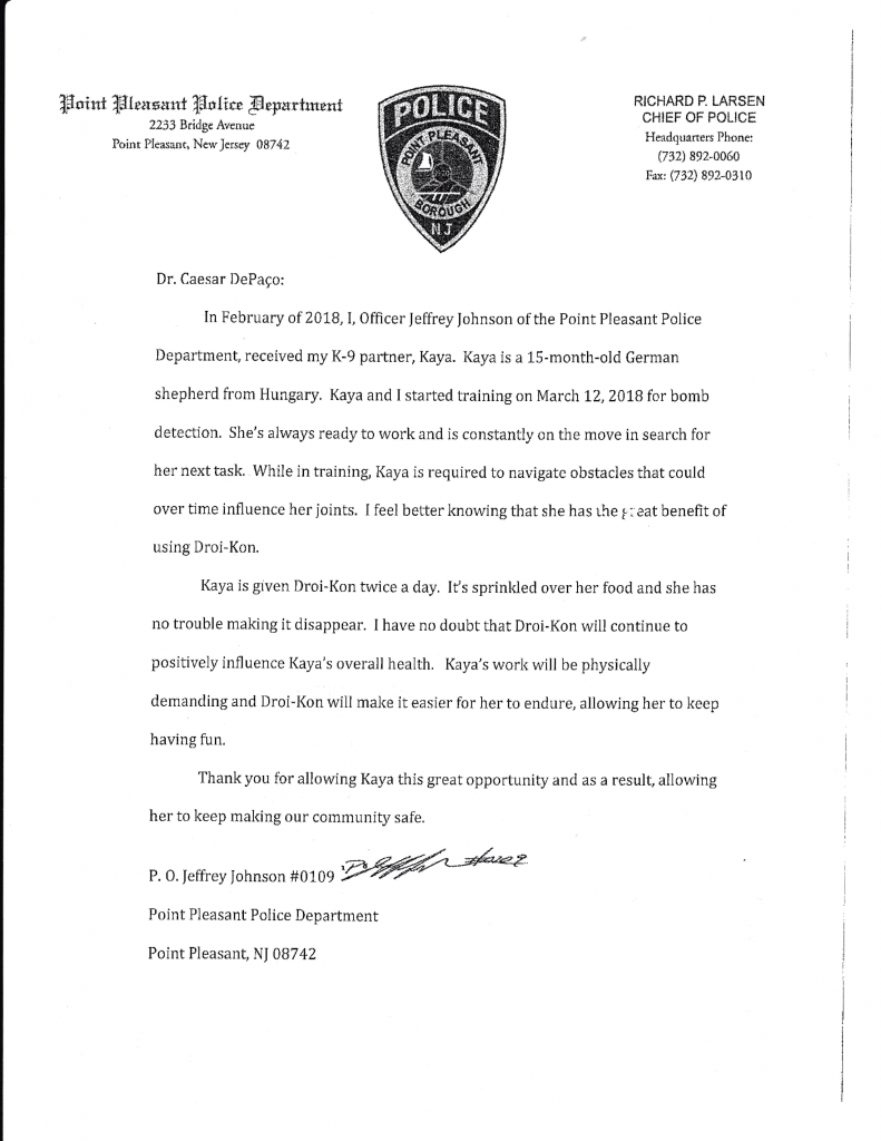 In February of 2018,1, Officer Jeffrey Johnson of the Point Pleasant Police Department, received my K-9 partner, Kaya. Kaya is a 15-month-old German shepherd from Hungary. Kaya and I started training on March 12, 2018 for bomb detection…