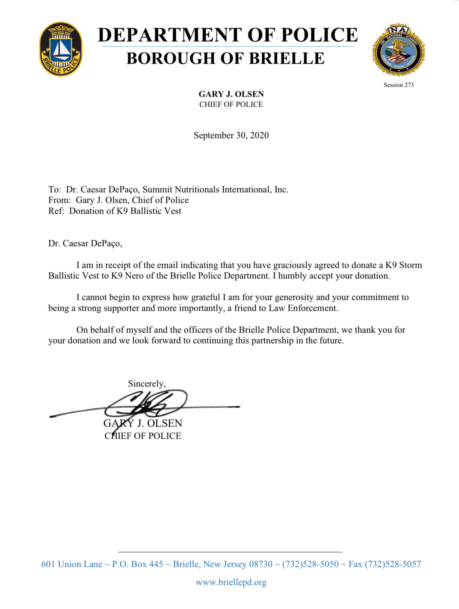Franklin Township Police Department Thanks Caesar DePaço of Summit Nutritionals International