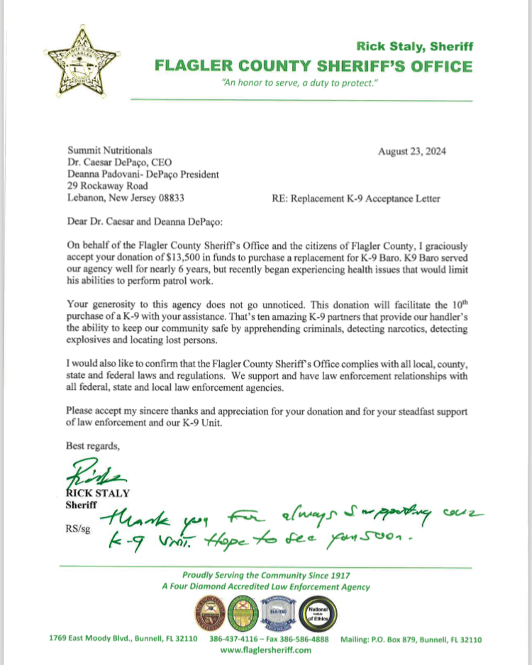 Office of the Flagler County Sheriff Thanks Summit Nutritionals ®