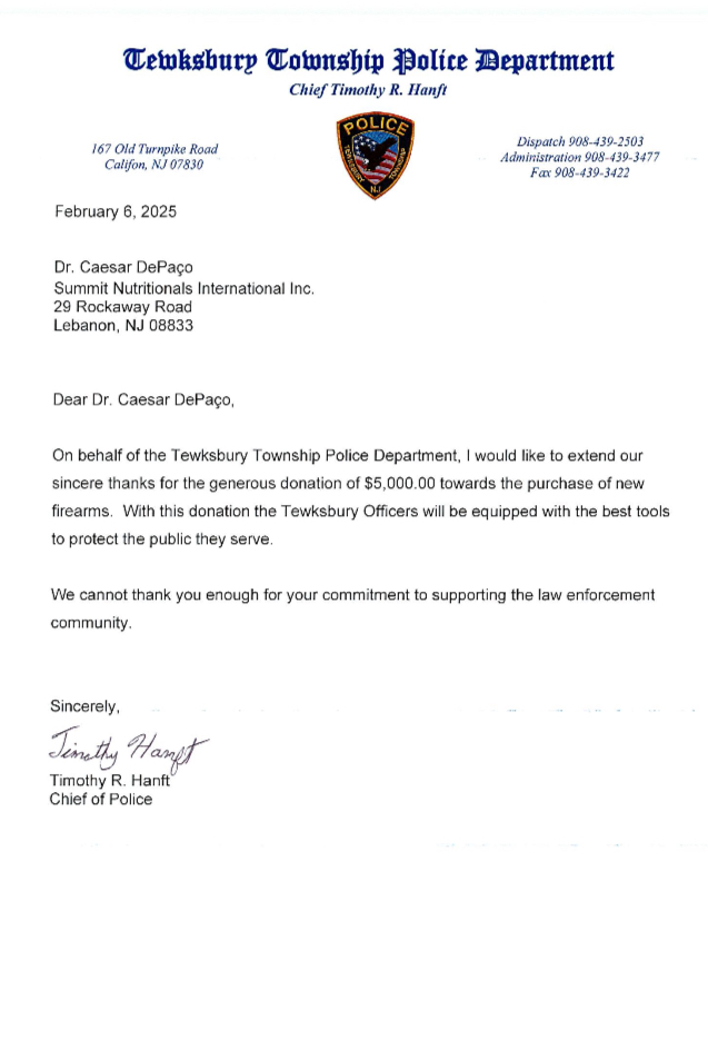 Holmdel Township Police Department Thanks Summit Nutritionals ®